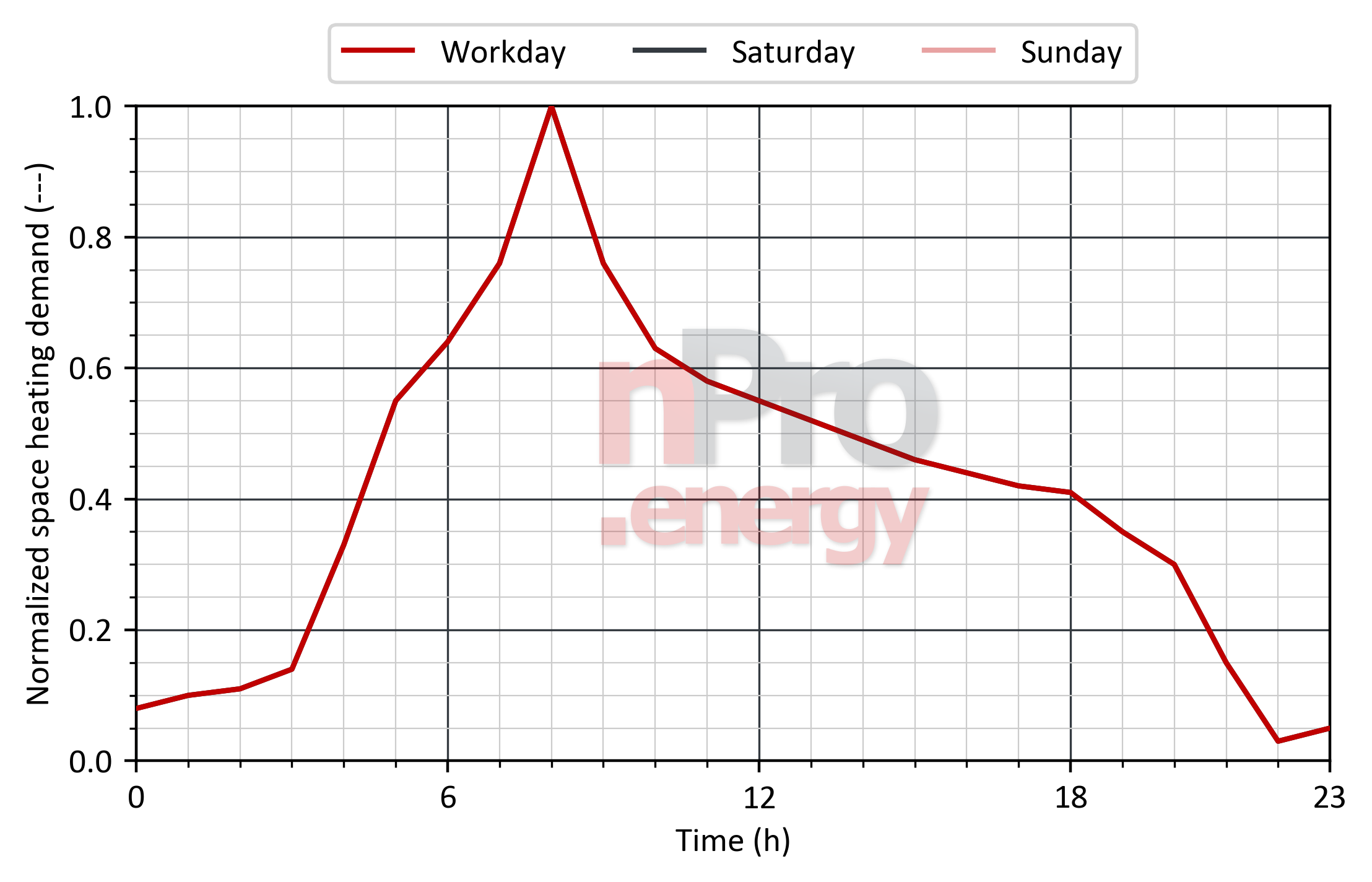 The load profiles for space heating for restaurants are illustrated in Figure 1. The profiles have a temporal resolution of one hour and are normalized. The profile for a working day, i.e. Monday to Friday, is shown in red. In the nPro tool, the normalized daily profiles are used as a calculation basis for creating demand profiles for restaurants. In the calculation, holidays are modeled like Sundays.